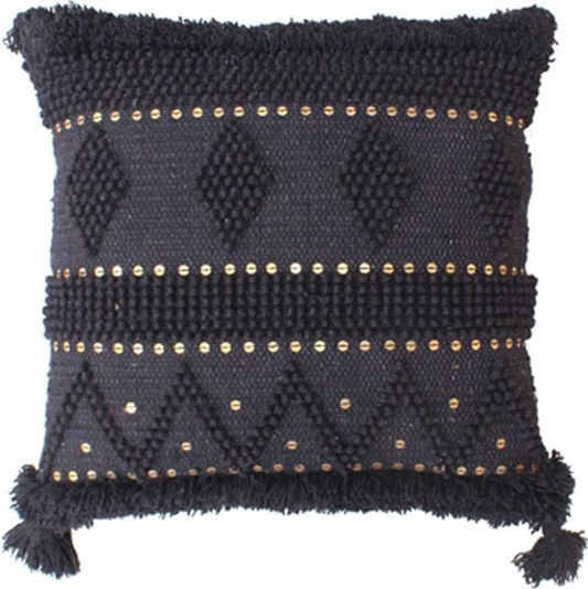 These Mordechai pillows feature hand-woven cotton and wool material in a stark, black color. Shimmering, gold-tone medallions stand out against the dark facade. Pillows are sold in sets of 4.