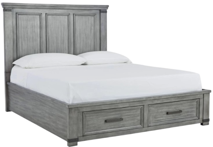 With its light weathered gray coloration, this storage bed conveys trend-right urban farmhouse style. Thick-profiled top moulding on the tall, mansion-scale headboard lends a fresh take on a timeless design.Read More